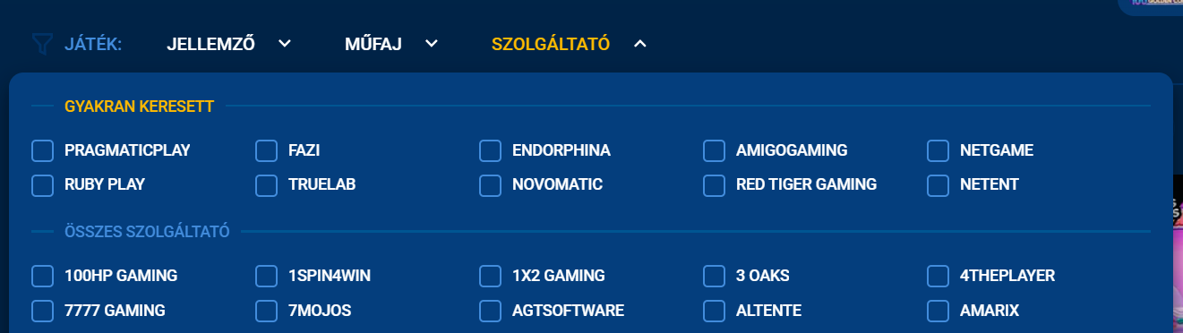 | Pragmatic Play | Slotok, élő kaszinó | 96.5–97.0 | Big Bass Bonanza, Gates of Olympus |